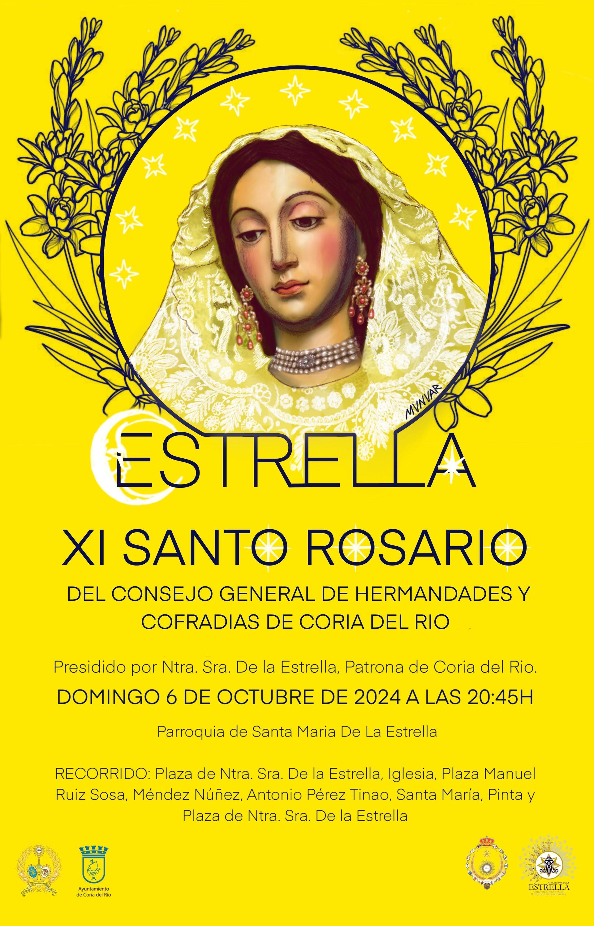 En el mes de octubre tiene lugar cada año el Santo Rosario, que se desarrolla por las calles de nuestra población; generalmente son las Hermandades de Gloria cuyos Titulares tienen la oportunidad de presidir este Rosario: año 2013, Ntra. Sra. de la Estrella; año 2014, el Simpecado de la Hermandad del Rocío de Coria; año 2015, Estandarte del Grupo Parroquial San Lucas Evangelista; y en 2016, ha sido la imagen de Ntra. Sra. del Rosario, la que por vez primera desde 1933 sale procesionalmente. En el año 2017 Nuestra Señora del Rosario es nombrada Madre y Protectora del Consejo General de Hermandades y Cofradías de Coria del Río, saliendo procesionalmente los años 2018 y 2019.